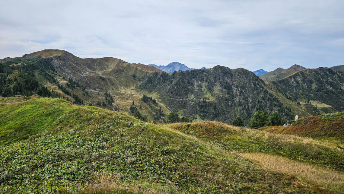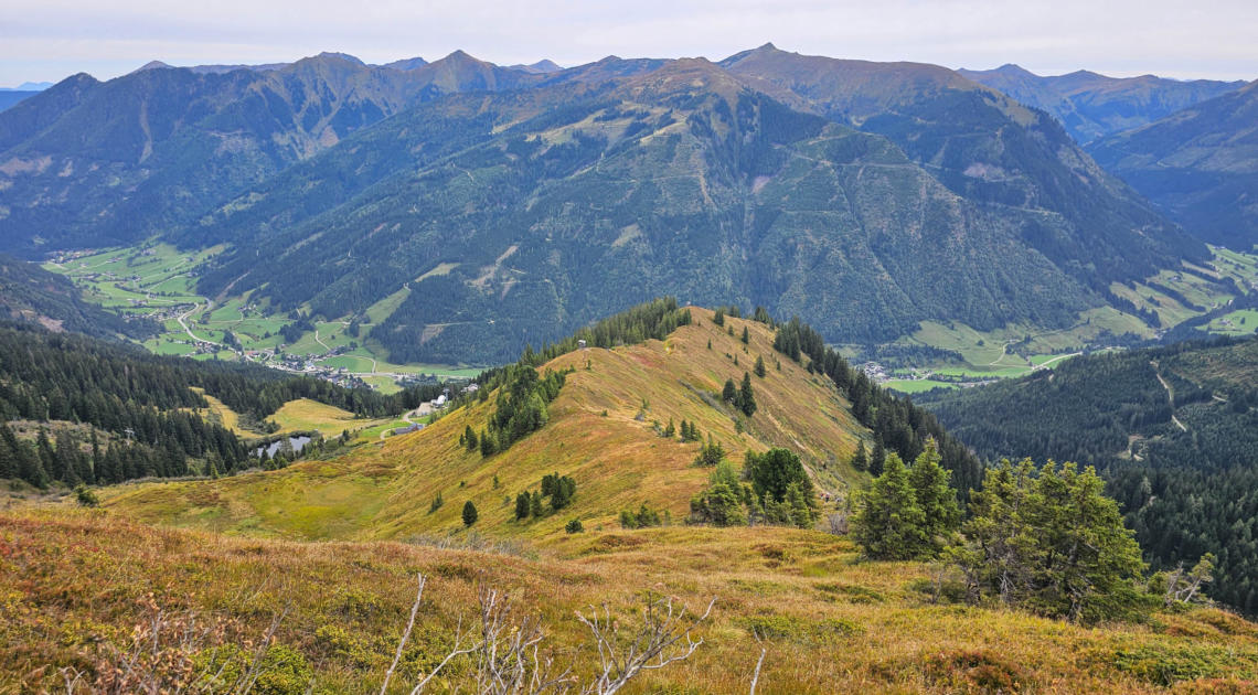 Donnersbachwald mit dem schönen Anstieg über den Jägersteig im Vordergrund.Dahinter gibt es jede Menge an Berge. Mittig das Hühnereck, links davon den Schober, rechts den Schreinl.
