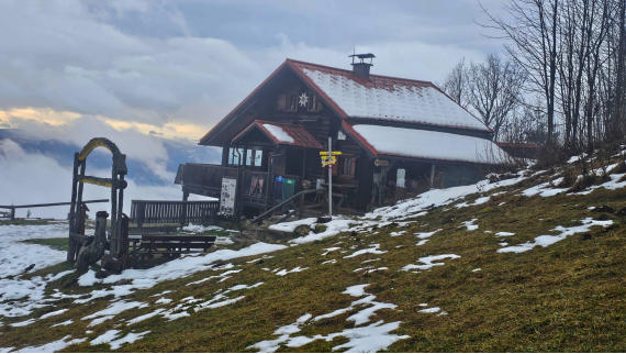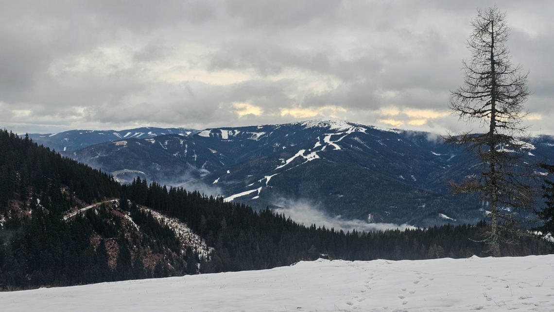 Oh... was nun? Wird es tatsächlich noch schön? Stuhleck mit Alois Günther-Haus, links hinten das Wechselgebiet in Sicht.