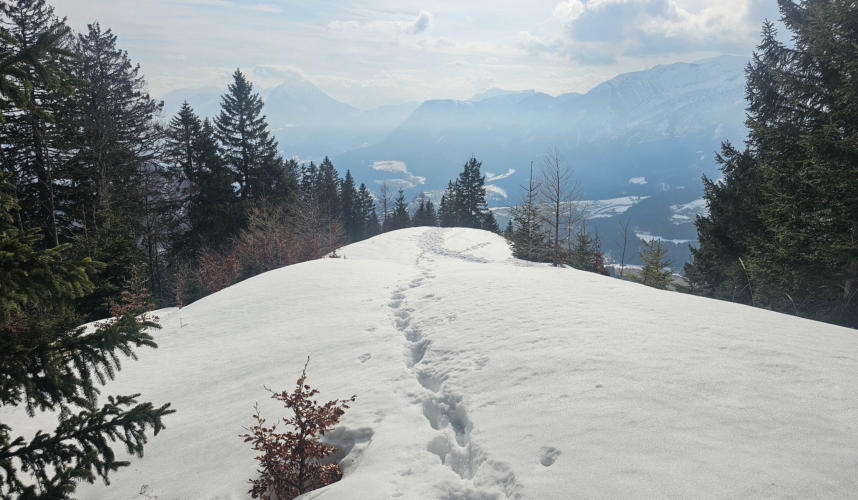 Wir wechseln uns mit der Führungsarbeit ab. Auf den ausgetretenen Wegen gehe ich voran, im tiefen Schnee darf Romana voran.