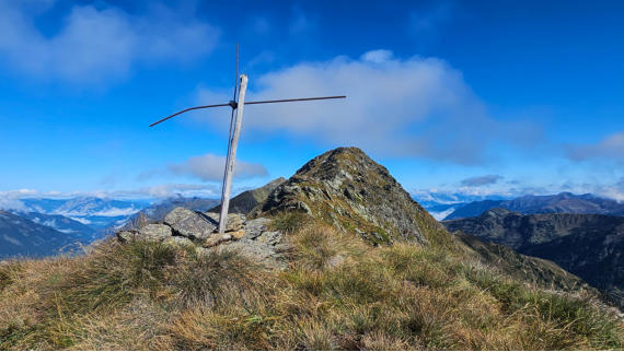 Erstes Ziel über den teils steilen Wiesenhang erreicht: Der Vorgipfel und Hauptgipfel (Bild rechts) von der Tischfeldspitze.