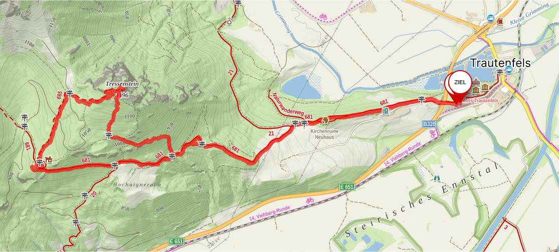 Eine kurze, aber sehr schöne Runde gibt es vom Schloss Trautenfels ausgehend, auf den Tressenstein.